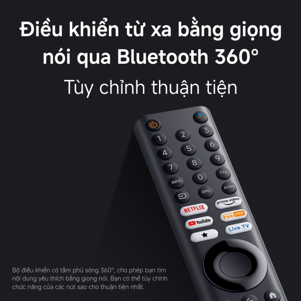Với micro tích hợp sẵn trên remote, bạn có thể ra lệnh mở ứng dụng, tìm phim, điều khiển thiết bị thông minh bằng tiếng Việt một cách tự nhiên.